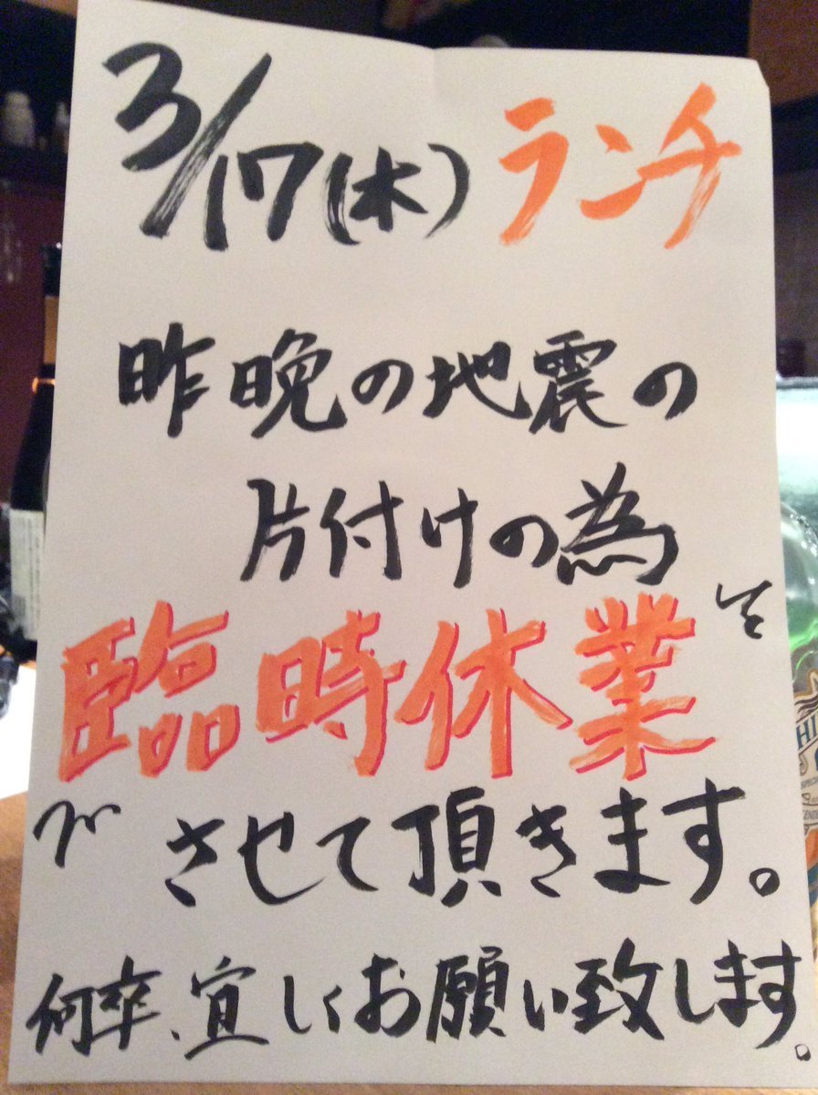 昨夜の地震の後片付けの為臨時休業とさせて頂きます。